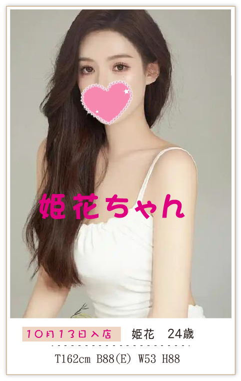 ☆☆☆12.15今日新人入店:姫花〜 美しいボディーラインは完璧! スタイルの良さに加えて女性らしい気遣いや振る舞いにも惹かれてしまうのではないでしょうか。 絶妙なマッサージテクに癒されてください。 オススメです!